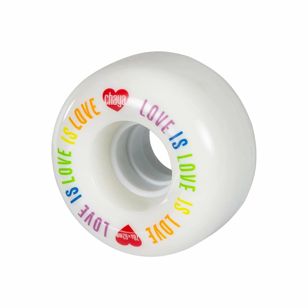The Love is Love wheel is a product name with a mission and a purpose. In respect of the LGBTQ + community and in support of its movement, we bring you this fun and vibrant rainbow-themed aftermarket wheel. Chaya also offers a complete Love is Love skate, which is looking awesome! Show your support by rocking this beautiful wheel when skating outside. Chaya cooperates with a well-known non-profit organization which is a global movement for love and equality, mobilizing thousands of people to build a world where no person will have to sacrifice their family or freedom, safety or dignity, because of who they are and/or who they love. The Love is Love wheel is a high-quality, highly durable wheel designed for outdoor skating. It is made of a soft urethane at 78A for a smooth and heavenly feel when skating on asphalt. However, the narrow profile of the wheel also allows for increased agility. The Love is Love is the perfect outdoor wheel and is a much-loved highlight of the Chaya wheels collection.