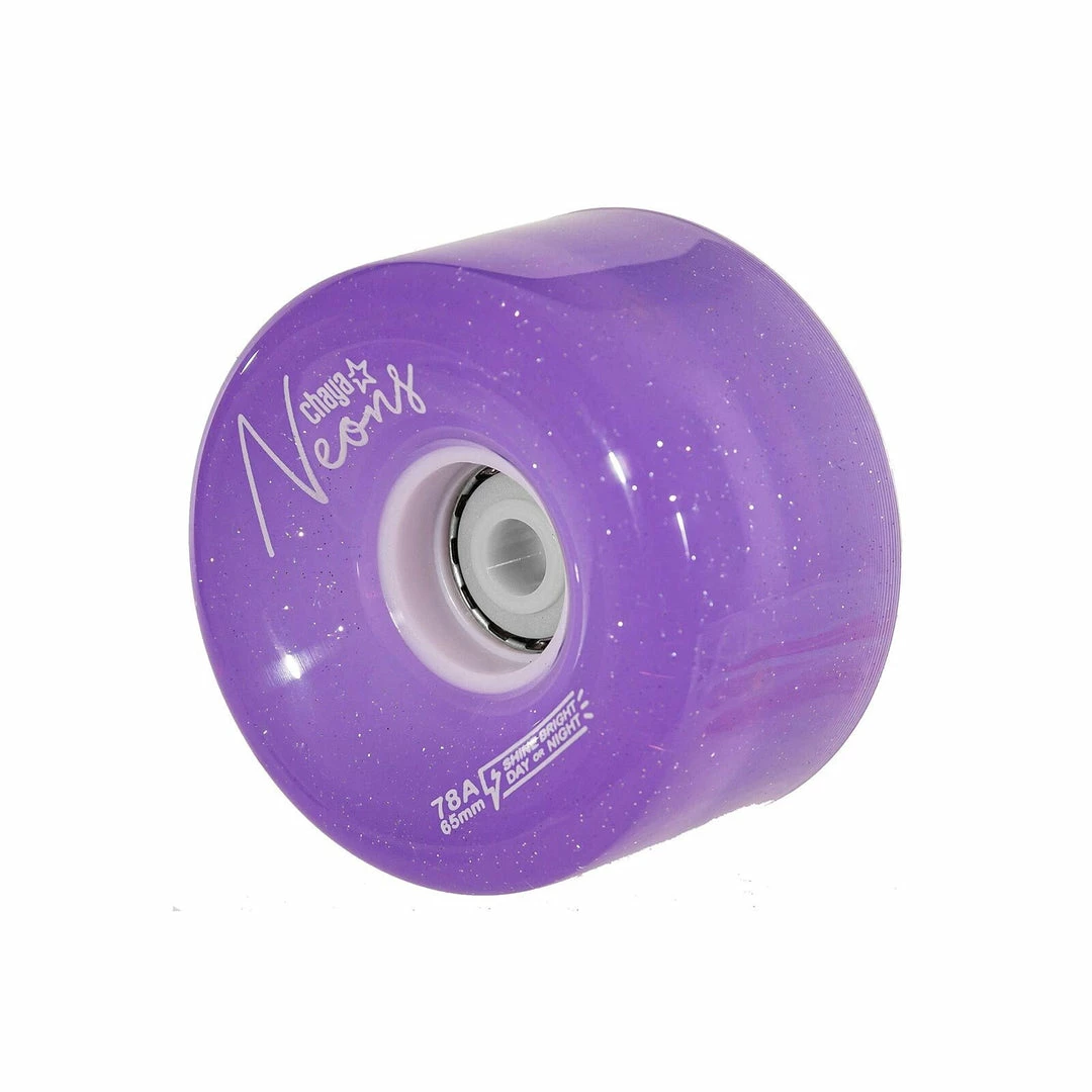 The Chaya Neons Purple LED outdoor quad wheel will ensure you stand out from the crowd. Built with long-lasting super high rebound polyurethane (PU) this outdoor wheel at 78A hardness is high quality, smooth rolling, and shines bright thanks to a series of white LED lights within the hub that gleam as the wheel spins. Perfect for shining bright at indoor roller discos or for evening cruising outdoors – just for fun, or to stay safe. Neons LED wheels are available in six bright shining colours – white, pink, blue, red, purple, and black.