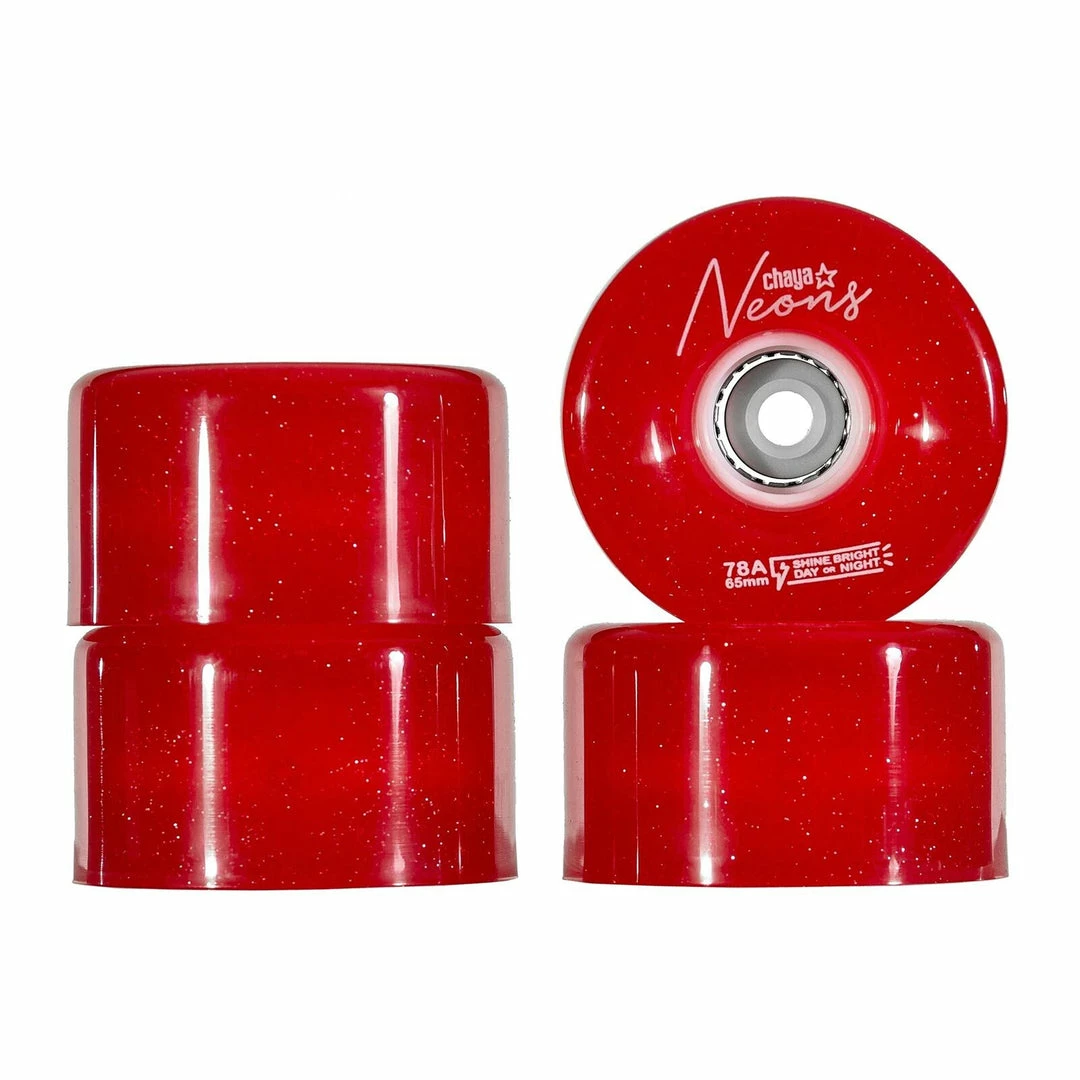 The Chaya Neons Red LED outdoor quad wheel will ensure you stand out from the crowd. Built with long-lasting super high rebound polyurethane (PU) this outdoor wheel at 78A hardness is high quality, smooth rolling, and shines bright thanks to a series of white LED lights within the hub that gleam as the wheel spins. Perfect for shining bright at indoor roller discos or for evening cruising outdoors – just for fun, or to stay safe. Neons LED wheels are available in six bright shining colours – white, pink, blue, red, purple, and black.