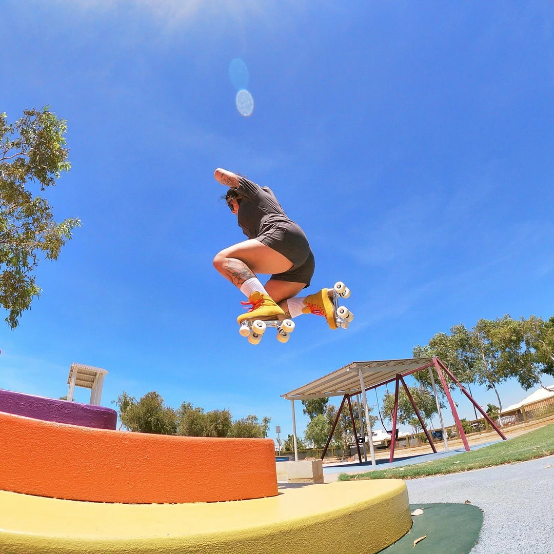 ‘Birak’ pays respects to one of the six seasons on Noongar boodja country where Chitty grew up, and is her birth season. The beginning of Indigenous seasons aren’t dictated by certain days or months, but by the change of weather, flora, and fauna. Birak is the first summer, hot and dry, and is regarded as the season of the young. Young animals leave the nest and start venturing beyond into the world. This playful image evokes the feeling of skating – embracing the season of the young, freedom, and remembering to be young at heart.
