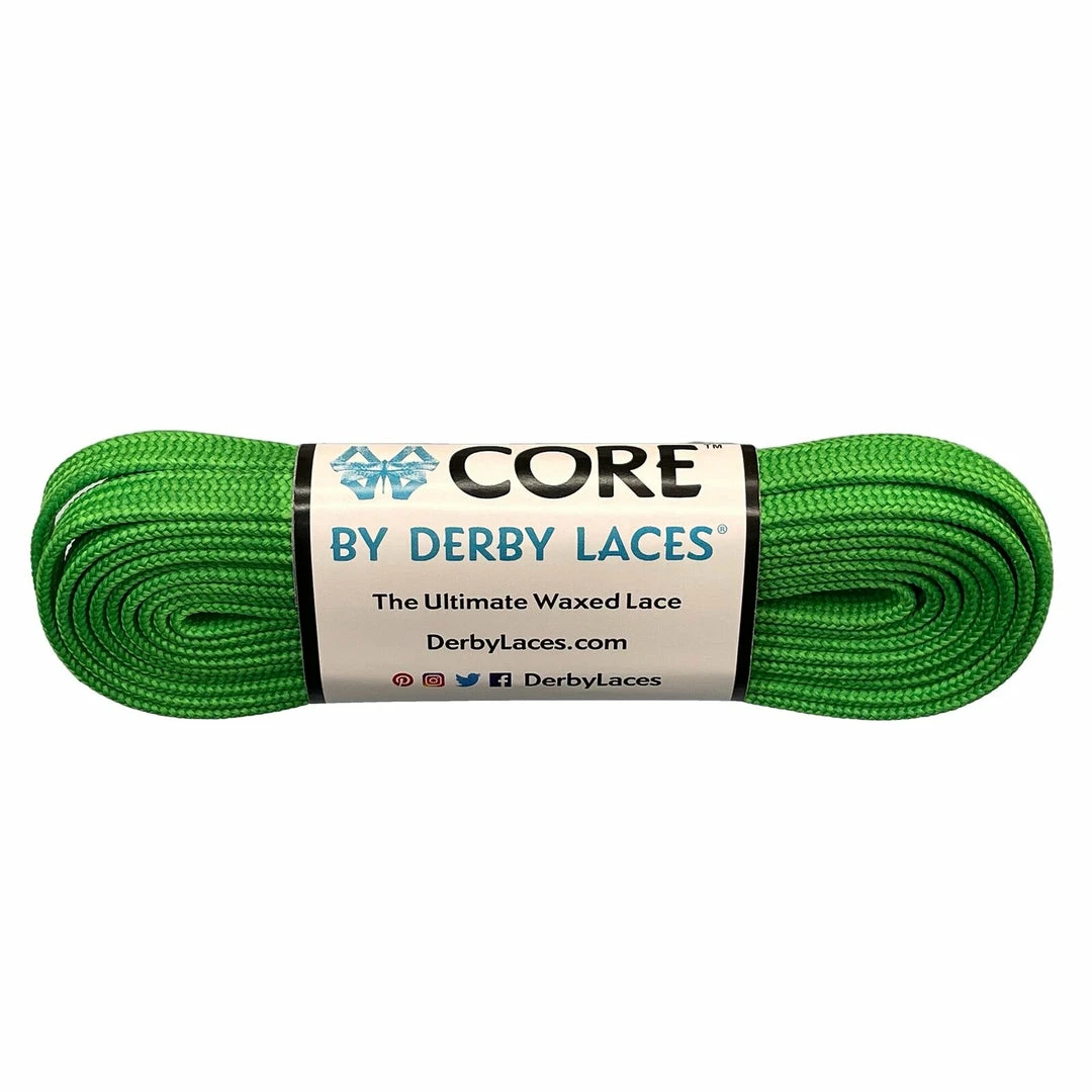 Derby Laces Core / Green are 6mm wide shoe laces with super strong fibers, high performance wax and molded tips. Suitable for shoes, boots, roller skates and other high performance lace needs. Sold as a pair.
