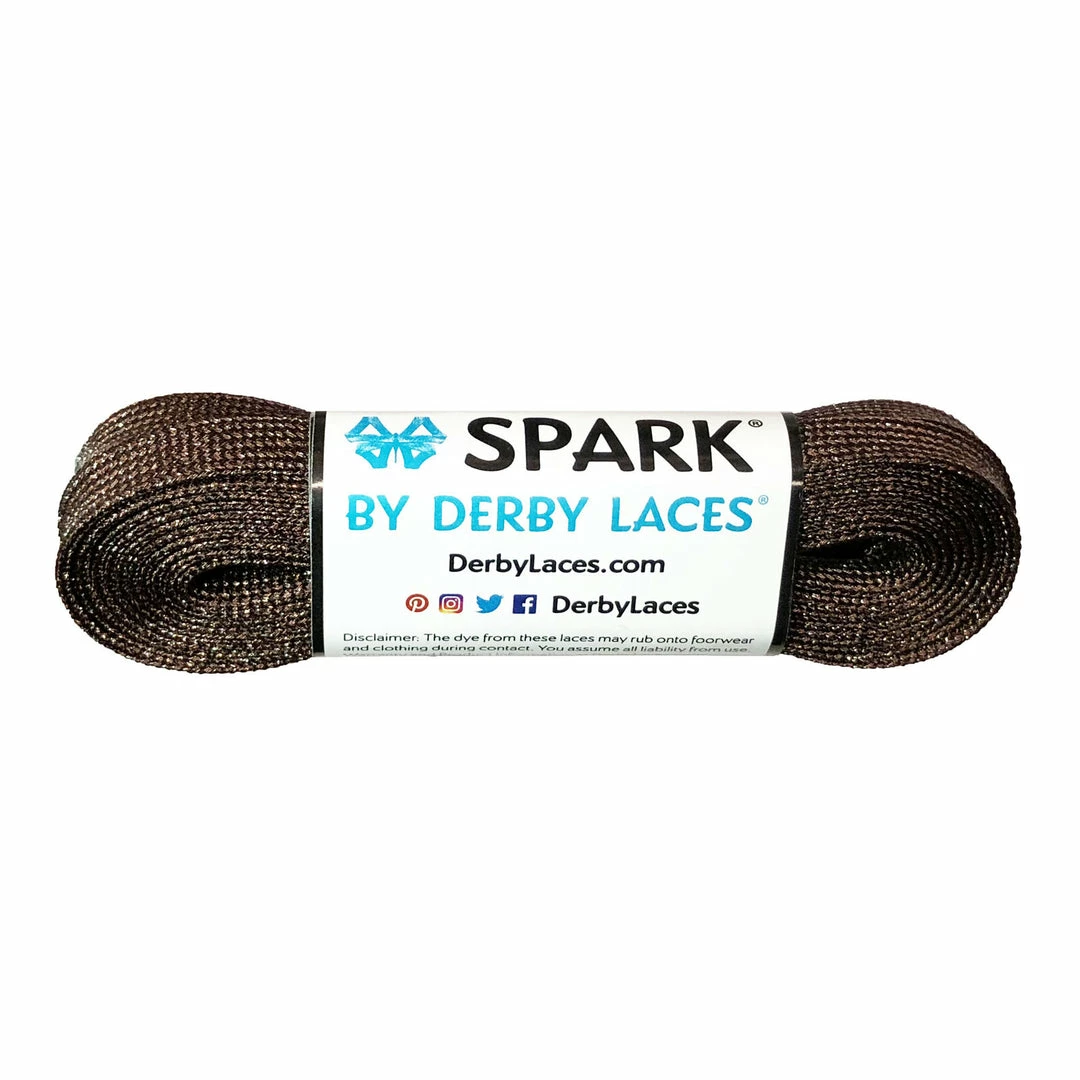 Derby Laces Spark / Brown are 8mm wide skate laces with strong metallic fibers, high-performance braid and hardened plastic tips. Suitable for roller derby and other high-performance skating. Sold as a pair.
