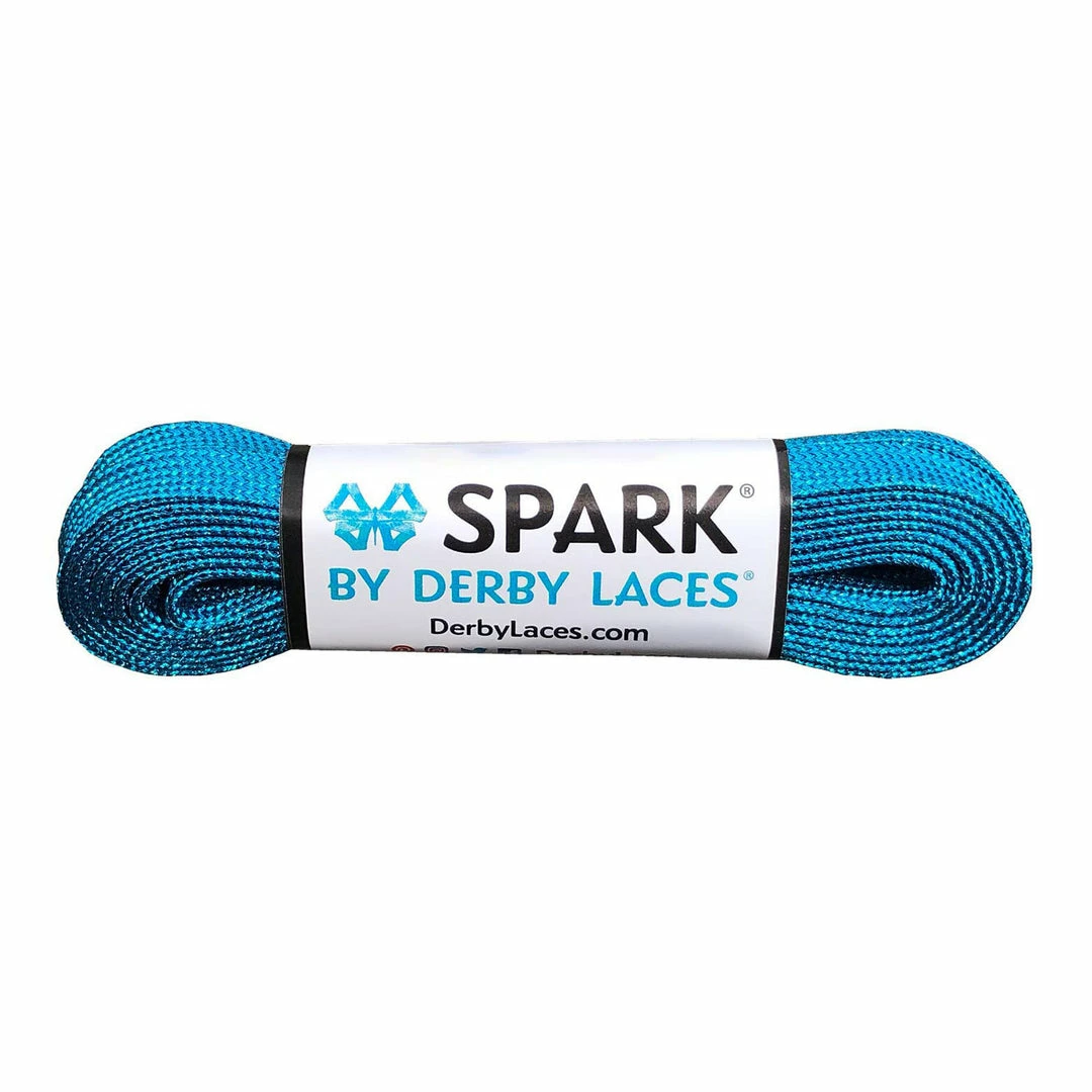 Derby Laces Spark / Pool Blue are 8mm wide skate laces with strong metallic fibers, high-performance braid and hardened plastic tips. Suitable for roller derby and other high-performance skating. Sold as a pair.