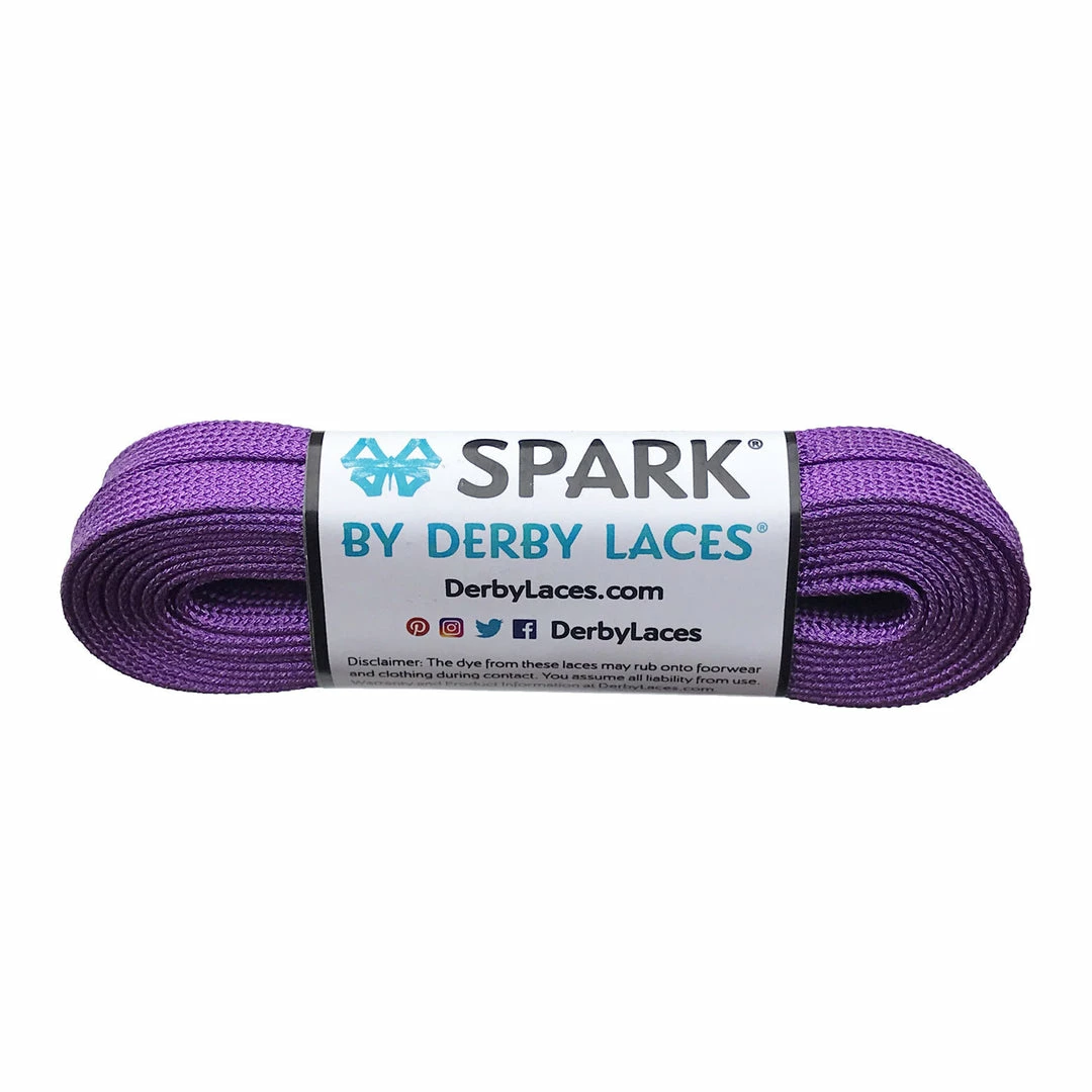Derby Laces Spark / Purple are 8mm wide skate laces with strong metallic fibers, high-performance braid and hardened plastic tips. Suitable for roller derby and other high-performance skating. Sold as a pair.