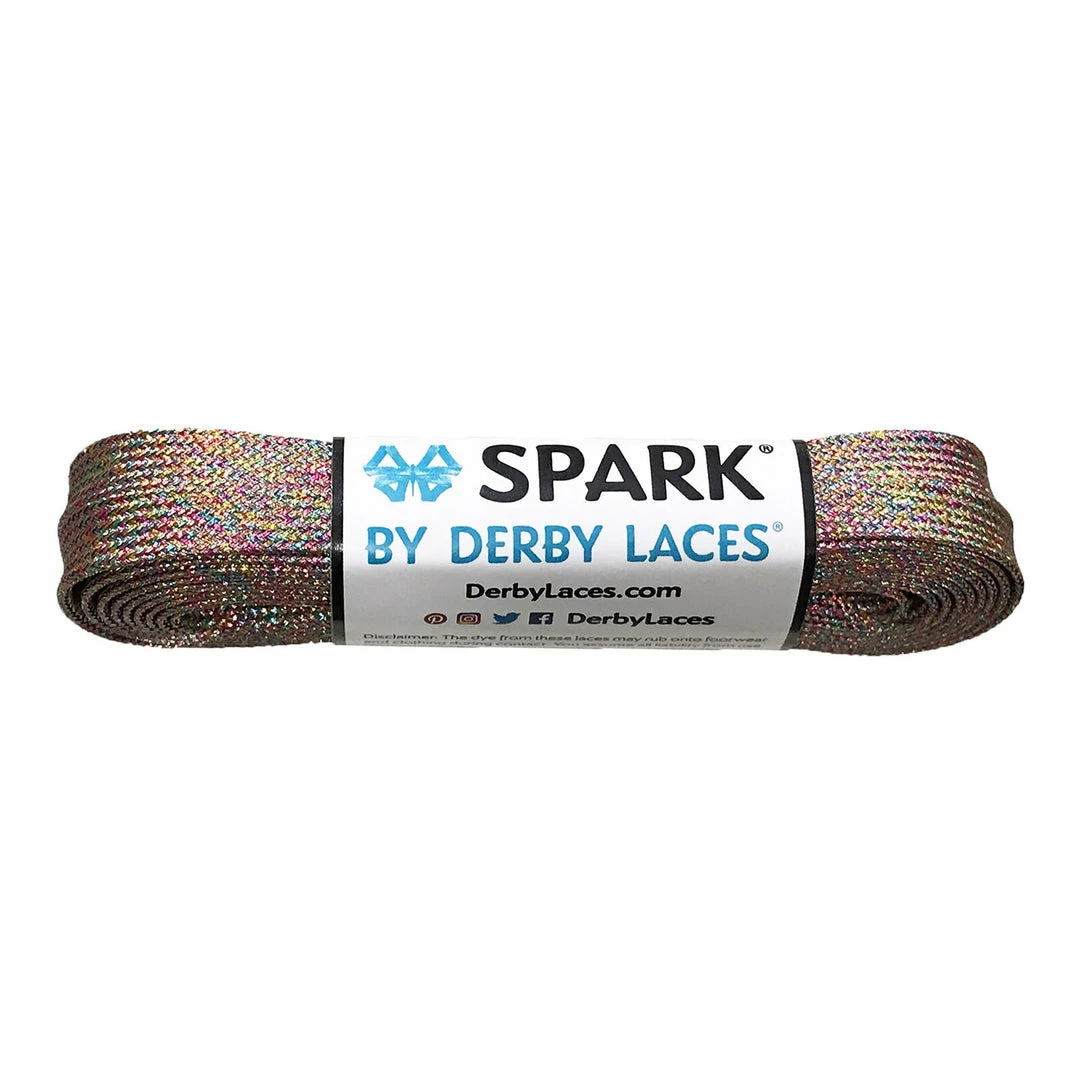 Derby Laces Spark / Rainbow Mirage are 8mm wide skate laces with strong metallic fibers, high-performance braid and hardened plastic tips. Suitable for roller derby and other high-performance skating. Sold as a pair.