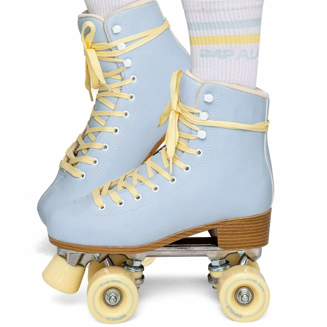 Impala Rollerskates in Sky Blue Yellow are the perfect entry-level / intermediate-level recreational quad skates that you can comfortably roll around in all day long!