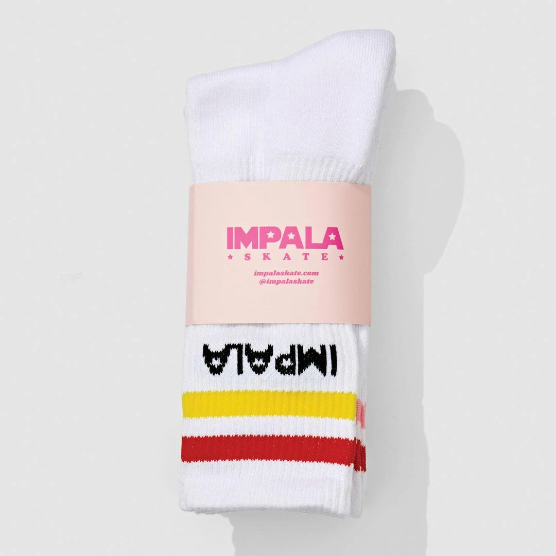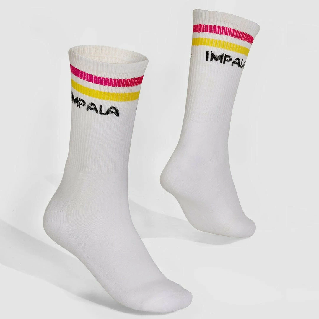 The Impala Stripe Socks pack includes three pairs of white crew socks with bright, colourful stripes and black logo accents.