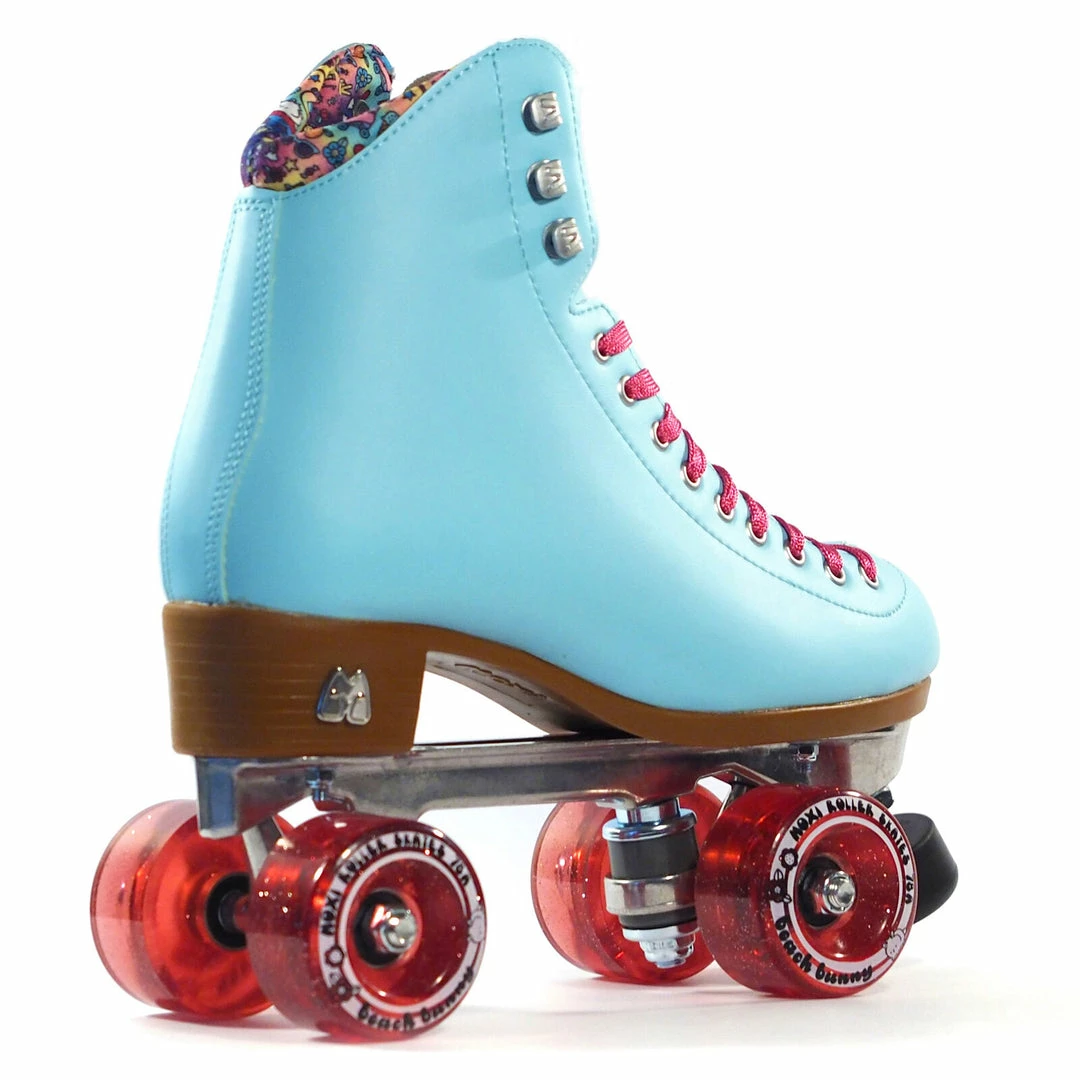 Bright laces that shine in the sun add to the fashion-forward design of the Beach Bunny, and the moisture-wicking Dri-Lexâ„¢ liner is printed with a custom pattern that was designed from scratch by Moxi team members for a skate that is 100% Moxi, inside and out. Complete with glittery high rebound urethane outdoor wheels and a pair of matching toe caps, the Beach Bunny is ready to accompany you on your next adventure!