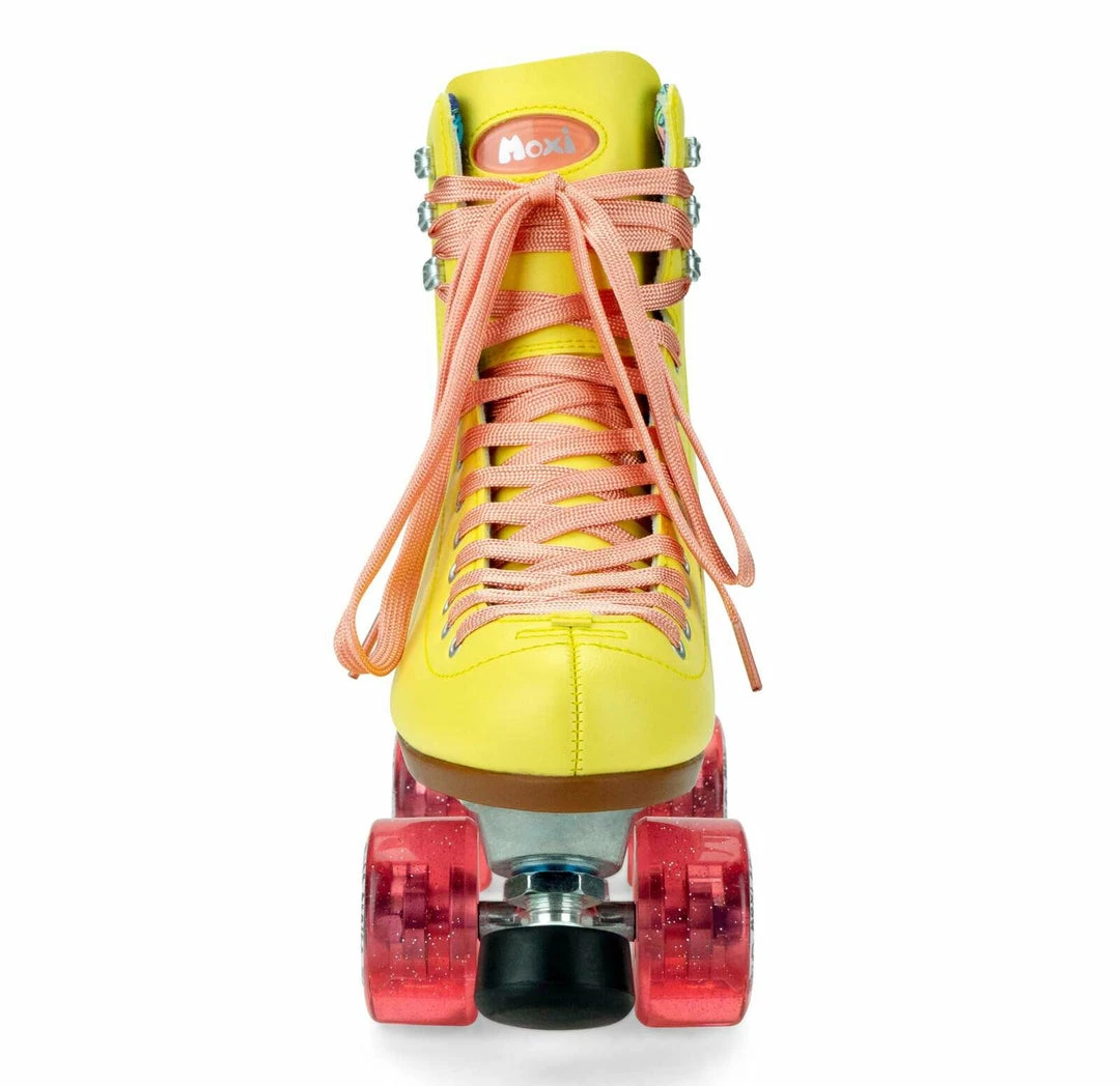 Bright laces that shine in the sun add to the fashion-forward design of the Beach Bunny, and the moisture-wicking Dri-Lexâ„¢ liner is printed with a custom pattern that was designed from scratch by Moxi team members for a skate that is 100% Moxi, inside and out. Complete with glittery high rebound urethane outdoor wheels and a pair of matching toe caps, the Beach Bunny is ready to accompany you on your next adventure!