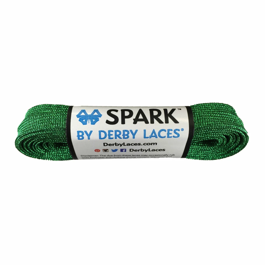 Derby Laces Spark / Green are 8mm wide skate laces with strong metallic fibers, high-performance braid and hardened plastic tips. Suitable for roller derby and other high-performance skating. Sold as a pair.