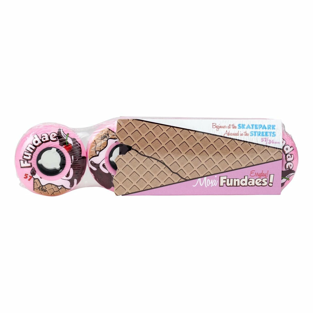 The Bubble Gum (Pink) Moxi Fundae Hybrid Wheels are 57mm x 34mm with 92A hardness, made from a smooth blend of urethane that rolls from street to park.
